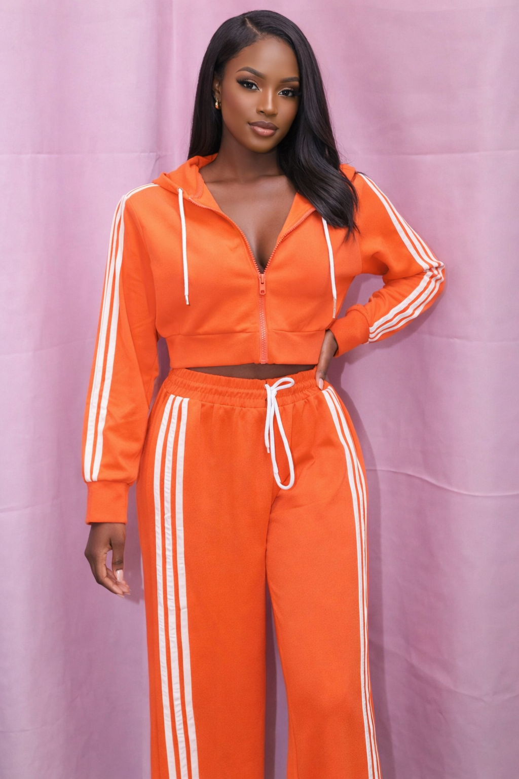 Get into this sporty slay! Our Orange Two-Piece Track Set is the perfect mix of comfort + cute. Featuring a flattering fit with an easy, stretchy feel, this set is made for running errands, travel days, chill weekends, or when you want that laid-back but put-together look. Pair it with sneakers for a sporty vibe or dress it up with a cute bag and accessories for that off-duty baddie energy.